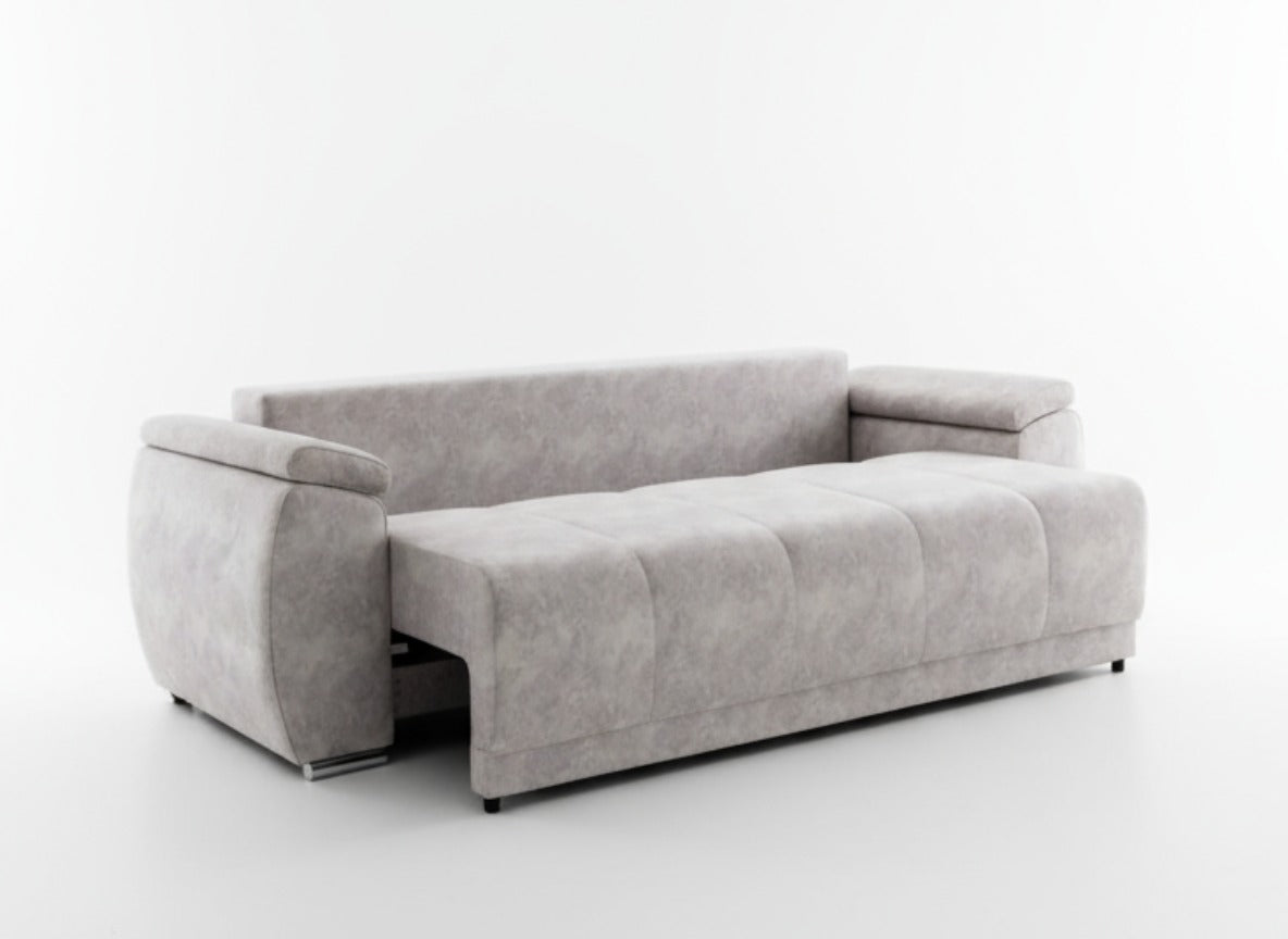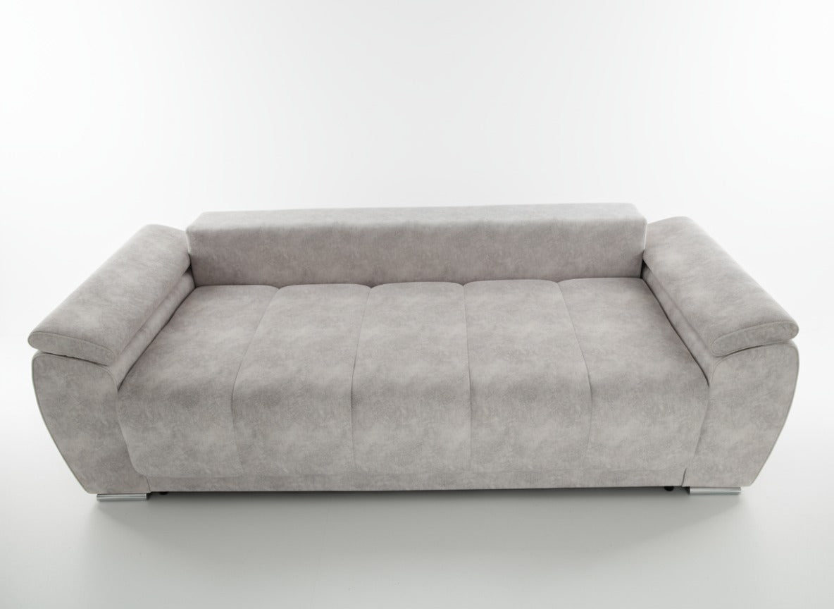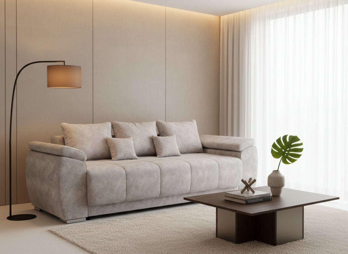 Această canapea modernă, tapițată într-o nuanță elegantă de gri deschis, combină confortul cu un design contemporan. Cu o formă robustă, dar rafinată, canapeaua dispune de trei perne mari pentru spătar și două perne decorative mai mici, oferind un plus de confort și stil. Brațele late și ușor curbate adaugă un aspect sofisticat, iar picioarele metalice cromate conferă stabilitate și un accent modern. Materialul moale și plăcut la atingere este ușor de întreținut, fiind ideal pentru orice living elegant și practic. Perfectă atât pentru relaxare zilnică, cât și pentru primirea oaspeților.
