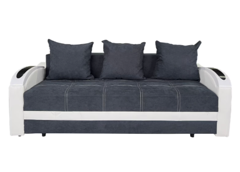 Canapeaua este dotată cu o ladă de depozitare accesibilă. Structura canapelei este confecționată din lemn, cu miez elastic și poliuretan. Tapițeria este realizată din stofă și piele ecologică, ambele materiale fiind ușor de întreținut și curățat. Canapeaua include, de asemenea, trei perne mari, care adaugă un plus de confort.