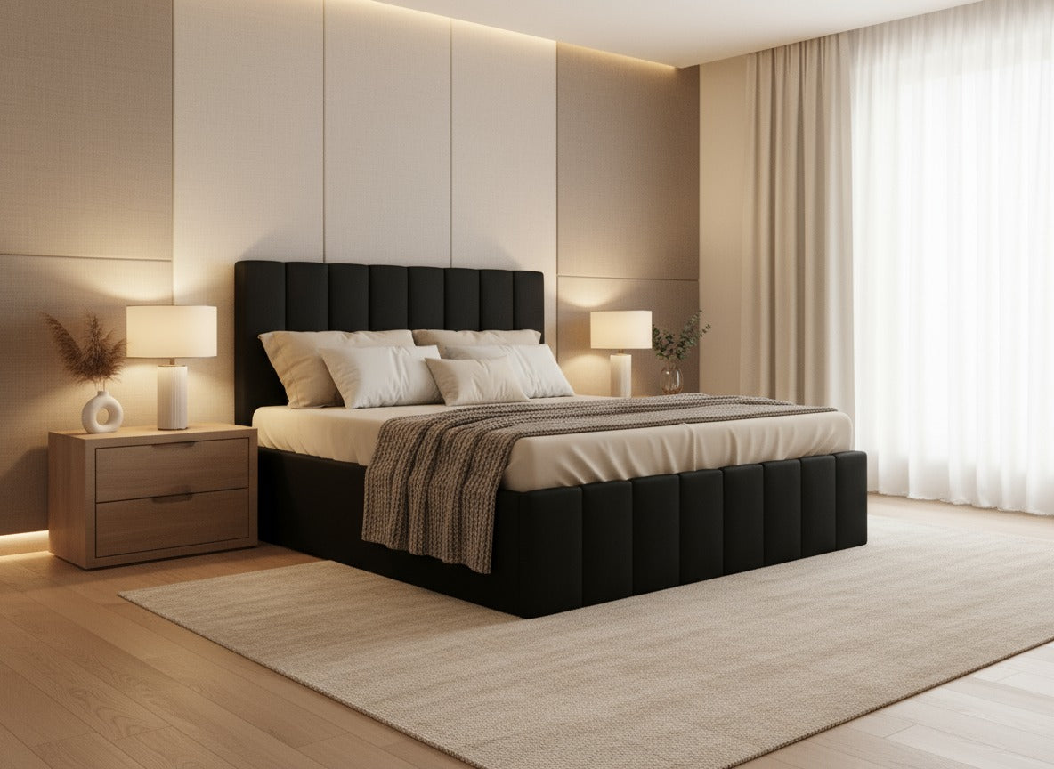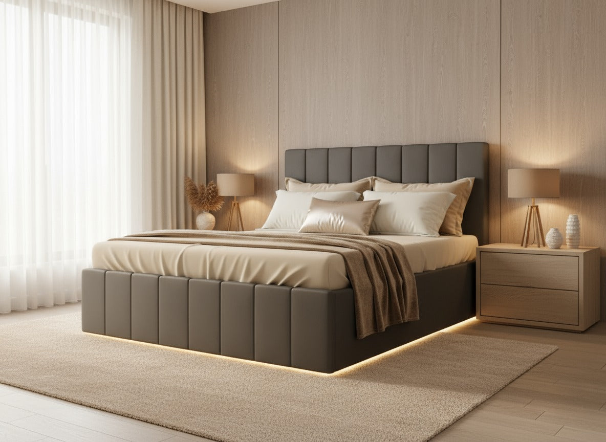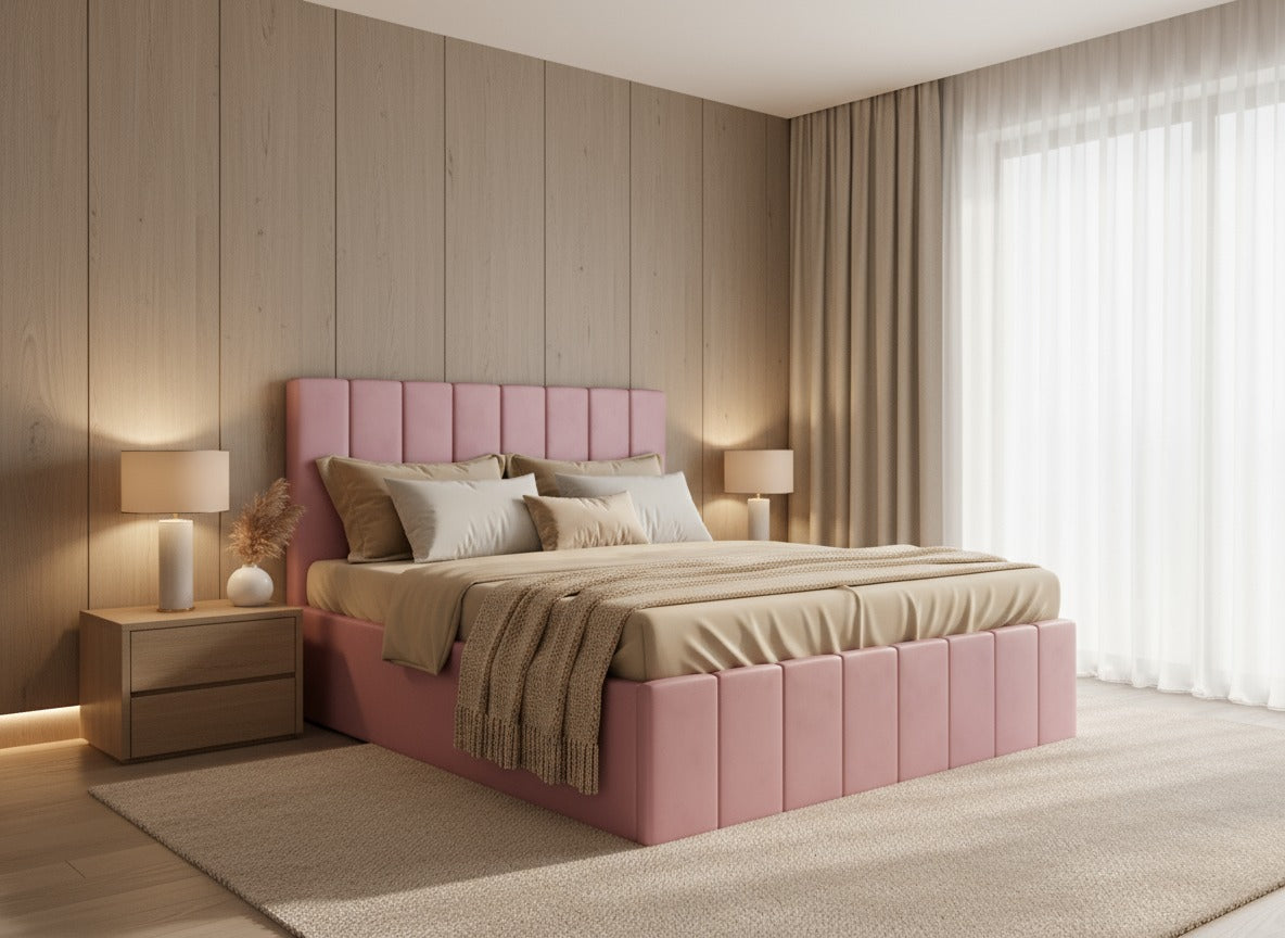 Acest pat modern se remarca prin designul sau elegant si rafinat.Cadrul si tablia sunt tapitate intr-un material moale care adauga o nota delicata si calda incaperii.