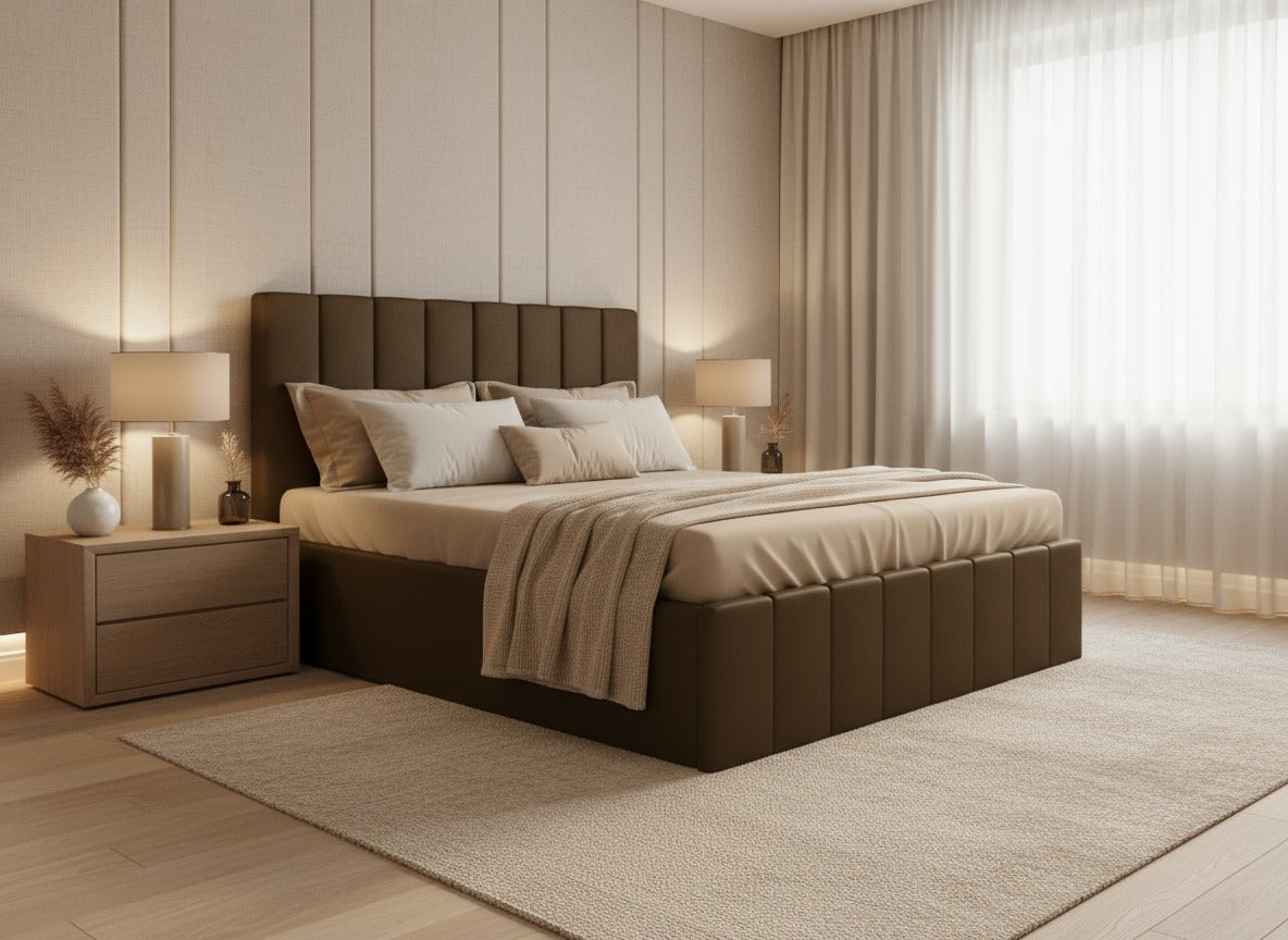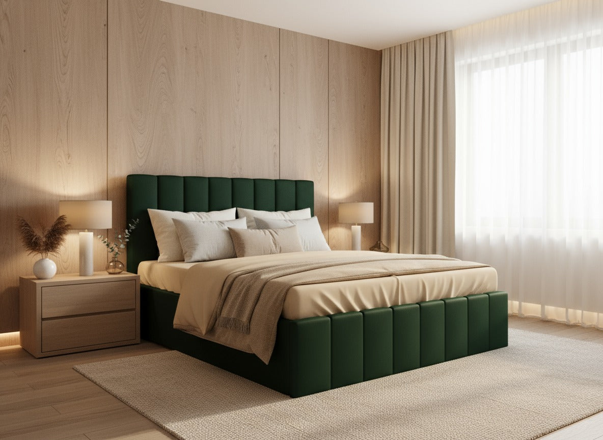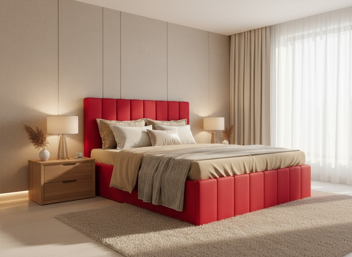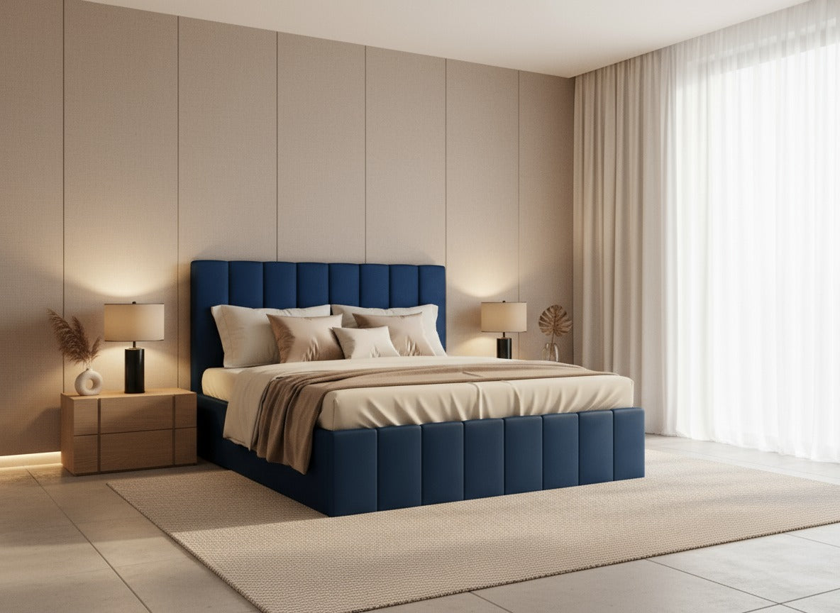 Acest pat modern se remarca prin designul sau elegant si rafinat.Cadrul si tablia sunt tapitate intr-un material moale care adauga o nota delicata si calda incaperii.