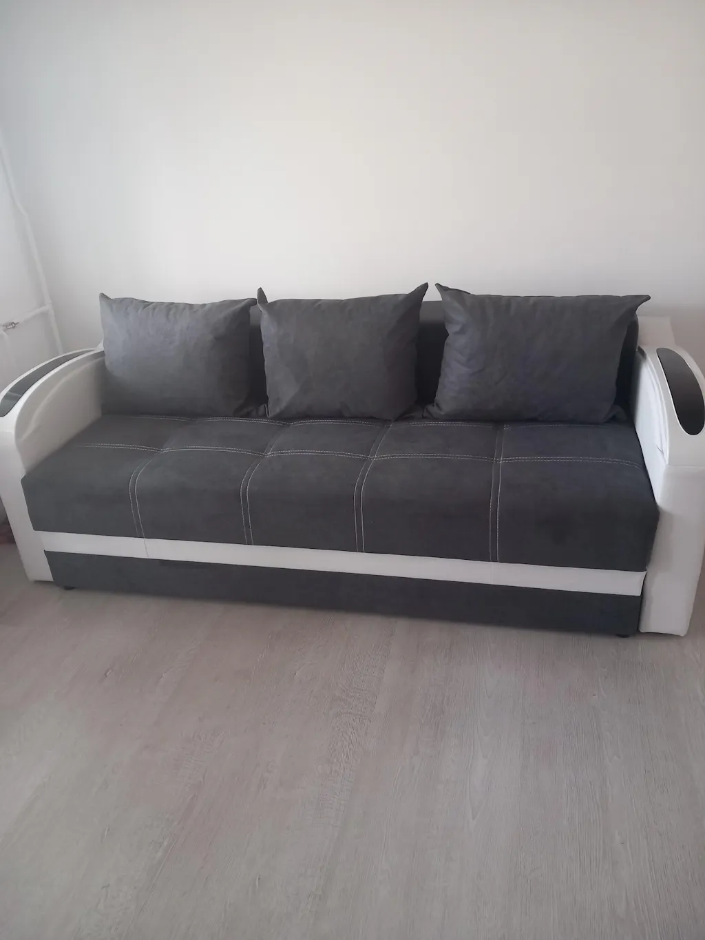 Canapeaua este dotată cu o ladă de depozitare accesibilă. Structura canapelei este confecționată din lemn, cu miez elastic și poliuretan. Tapițeria este realizată din stofă și piele ecologică, ambele materiale fiind ușor de întreținut și curățat. Canapeaua include, de asemenea, trei perne mari, care adaugă un plus de confort.