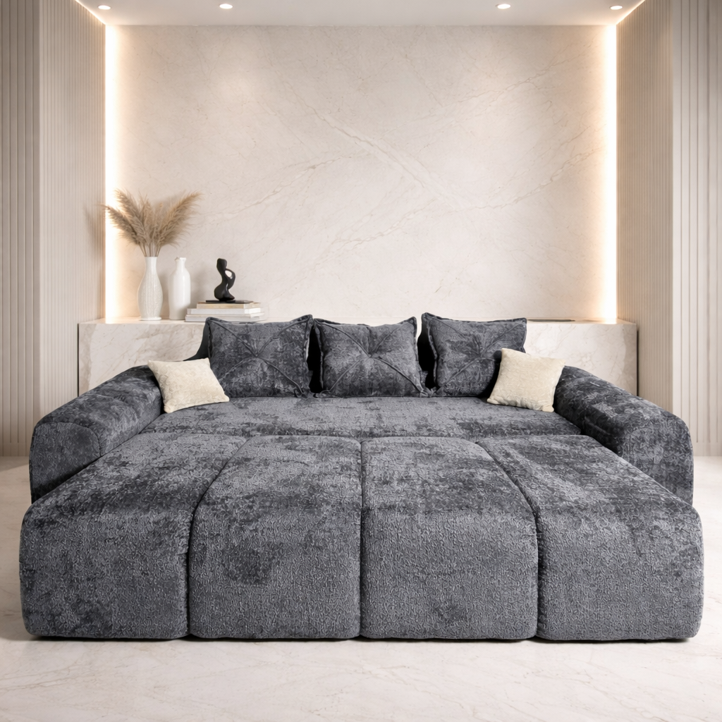 Datorită sistemului de extindere, canapeaua Atlas se transformă rapid într-un spațiu de dormit foarte generos, potrivit atât pentru oaspeți, cât și pentru utilizare ocazională. Culoarea elegantă și textura stofei permit integrarea ușoară în amenajări moderne, minimaliste sau contemporane.